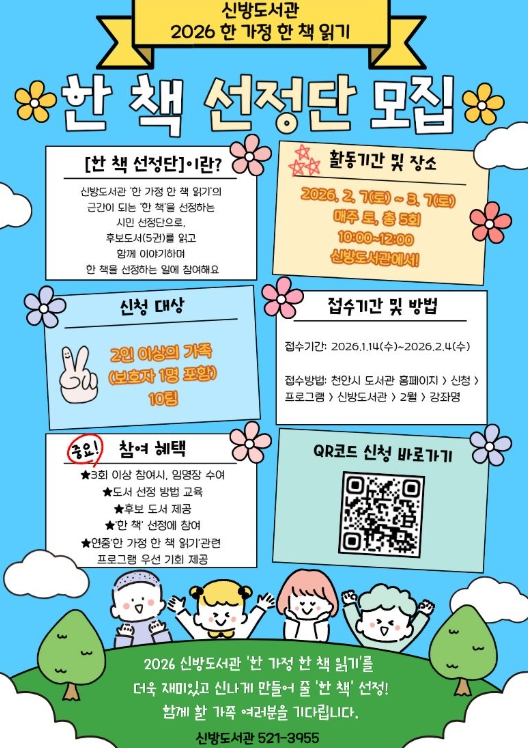 [뉴스노크=김인호 기자] 천안시 신방도서관은 ‘한 책 선정단’ 참여 가족을 모집한다고 20일 밝혔다.