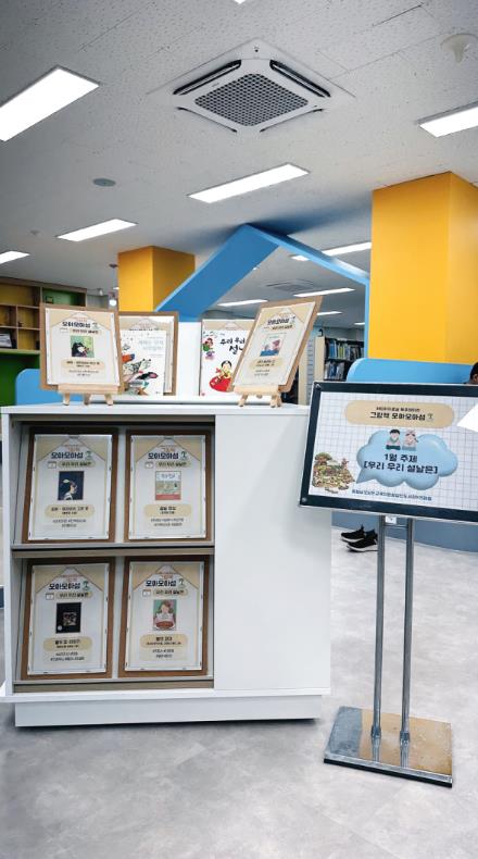 1층 어린이자료실에서 진행되는 그림책 북큐레이션‘그림책 모아모아섬’은 도서관 동아리‘크레용’과 협력해 해시태그를 활용한 월별 추천 그림책을 전시하여 어린이들이 흥미롭게 책을 접하고 창의적인 독서 경험을 쌓을 수 있도록 지원한다.