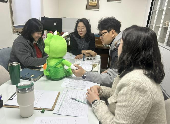 | ▲ 충남 계룡시 노인복지관 직원들이 AI 돌봄인형을 활용한 비대면 말동무 서비스 지원사업 회의를 진행하고 있다 |