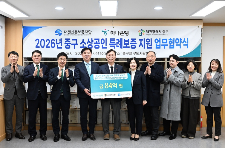 [뉴스노크=김인호 기자] 대전 중구는 지난 2024년과 2025년에 이어 올해에도 중구 관내 소상공인 경영안정자금 지원을 위해 대전신용보증재단, 하나은행과 협약을 맺고 총 84억 원 규모의 소상공인 특례 보증을 지원한다고 15일 밝혔다.