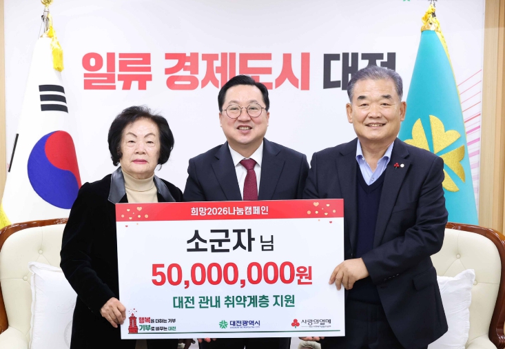 [뉴스노크=김인호 기자] 대전시는 15일 오전 시청 10층 응접실에서 아너소사이어티 회원인 소군자 기부자(124호)로부터 대전사회복지공동모금회를 통해 관내 취약계층 지원을 위한 성금 5천만 원을 전달받았다.
