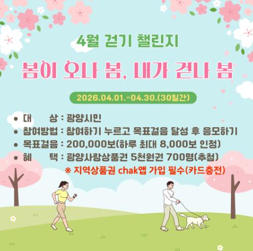 | ▲ 광양시, 워크온 ‘봄이 오나 봄, 내가 걷나 봄! 4월 걷기 챌린지’ 운영 |