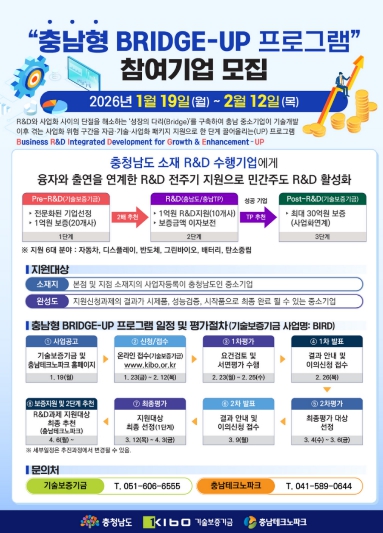 지원 분야는 자동차·디스플레이·반도체·그린바이오·배터리·탄소중립 등 6대 산업군으로, 오는 19일 관련 공고를 내고 기술보증기금 누리집(충남형 BIRD 프로그램)을 통해 2월 12일까지 신청받을 예정이다.