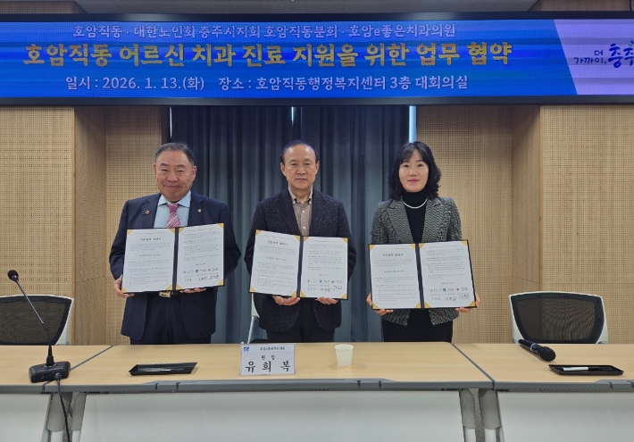 [뉴스노크=김인호 기자] 충주시 호암직동행정복지센터(동장 김민남)는 13일 대한노인회 충주시지회 호암직동분회(분회장 유덕상), 호암e좋은치과의원(원장 유희복)과 관내 어르신들의 건강 증진과 의료 접근성 향상을 위한 진료협력 협약을 체결했다.