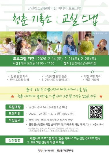 [뉴스노크=김인호 기자] (재)당진시청소년재단 당진청소년문화의집(관장 유수민)은 오는 2월 14일부터 28일까지 매주 토요일, 14시부터 17시까지 관내 14~19세 청소년을 대상으로 미디어 프로그램 [청춘 기록소 : 교실 스냅]을 운영할 예정이다.
