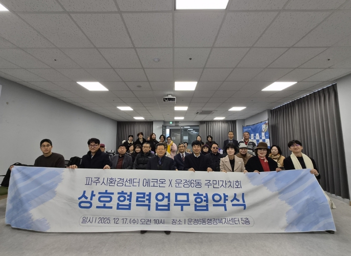 [뉴스노크=김인호 기자] 운정6동 주민자치회는 12월 17일 오전 10시, 운정6동 행정복지센터에서 파주시환경센터 ‘에코온’과 ‘지역 환경 의제 실천 및 기후행동 협력을 위한 업무협약’을 체결하고, 이어 마을 소식지 '초롱꽃향기로' 2호 제작 성과공유회를 개최했다.