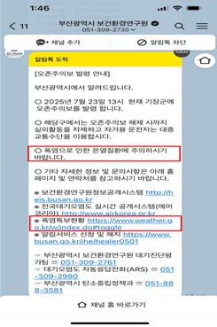 이번 서비스는 부산지역 27개 도시대기측정소의 실시간 기온 자료를 활용해 시민들에게 폭염 상황을 신속히 알리고, 온열질환 등 건강 피해를 예방하고자 마련됐다.