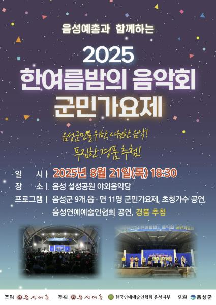 [뉴스노크=김인호 기자] 음성군은 오는 21일 오후 6시 30분 음성 설성공원 야외음악당 일원에서 ‘2025 한여름밤의 음악회 및 군민가요제’를 개최한다고 밝혔다.