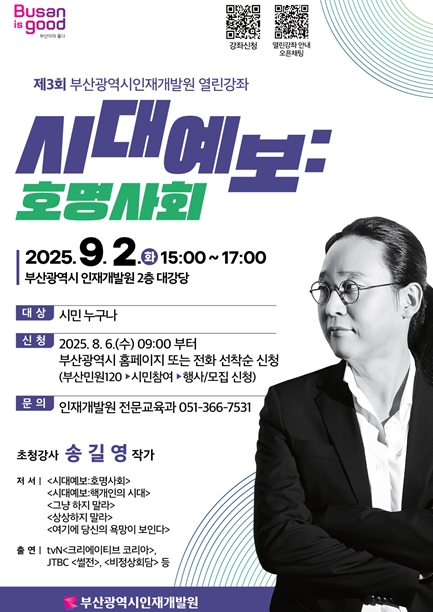 송광행 인재개발원장은 “시민 여러분이 사회 흐름을 이해하고 미래를 준비하는 데 유익한 시간이 되길 바란다”라며, “앞으로도 지식과 경험을 나눌 수 있는 강연을 꾸준히 이어가겠다”라고 전했다.