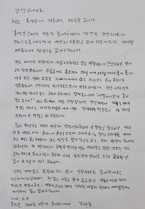 또 전 씨는 “교육용 키오스크에는 어르신을 위한 다양한 인지능력 테스트 프로그램이 있는데 스스로 정신건강 상태를 점검할 수 있어 큰 도움이 되고 있다”라며 “끊임없이 새로운 세상과의 연결을 만들어주신, 만들어주고 계신 디지털배움터에 다시 한번 깊이 감사드린다”라고 적었다.