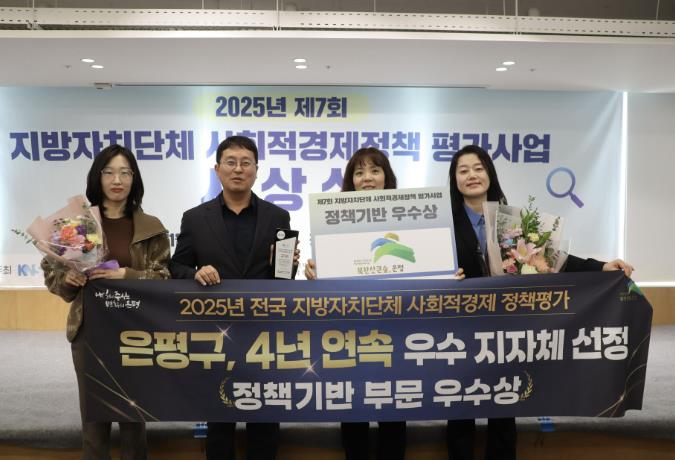 [뉴스노크=김인호 기자] 서울 은평구는 ‘2025년 제7회 전국 지방자치단체 사회적경제정책 평가’에서 ‘정책기반 부문 우수상’을 수상했다고 밝혔다.