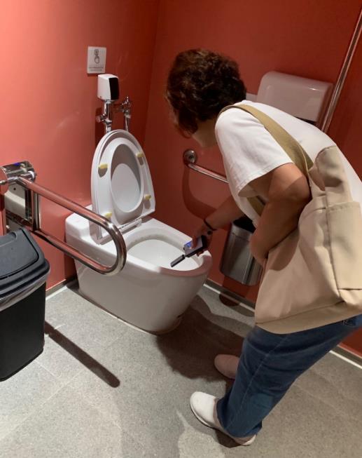 ▲ 불법촬영 시민감시단이 탐지기를 사용해 불법촬영 기기 설치 여부를 확인하고 있다.
