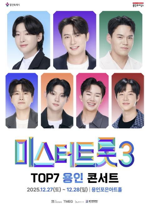 [뉴스노크=김인호 기자] 용인문화재단은 오는 12월 27일부터 28일까지 용인포은아트홀에서 ‘미스터트롯3 TOP7 콘서트’를 선보인다. 공연은 27일 오후 1시·6시, 28일 오후 1시 총 3회 진행된다.