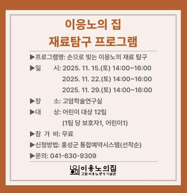 [뉴스노크=김인호 기자] 홍성군 고암이응노생가기념관은 오는 15일, 22일, 29일(매주 토요일) 오후 2시부터 4시까지 ‘재료탐구 프로그램’을 운영한다고 밝혔다.