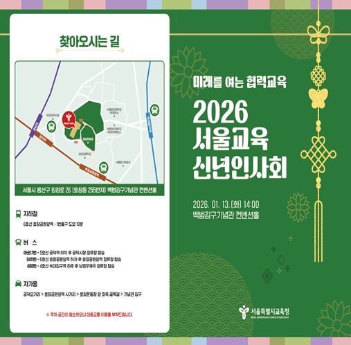[뉴스노크=김인호 기자] 서울특별시교육청은 오는 1월 13일에 용산구 백범김구기념관 컨벤션홀에서 ‘2026년 서울교육 신년인사회’를 개최한다.