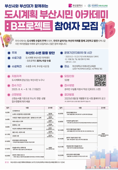 [뉴스노크=김인호 기자] 부산시는 부산대학교(미래시민교육원)와 함께 오는 9월 2일부터 10월 23일까지 '도시계획 부산시민 아카데미:비(B)프로젝트'를 운영한다고 밝혔다.