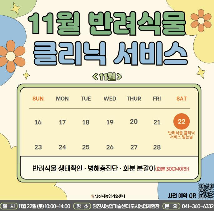 [뉴스노크=김인호 기자] 당진시농업기술센터는 시민들의 반려식물 관리 역량을 높이고, 도시농업의 저변 확대를 위해 오는 22일 오전 10시부터 오후 2시까지 농업기술센터 도시농업체험장에서‘반려식물 클리닉 서비스’를 운영한다고 18일 밝혔다.