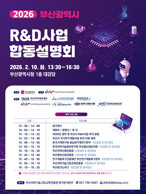 [뉴스노크=김인호 기자] 부산시는 내일(10일) 오후 2시 시청 대강당에서 지역 과학기술 경쟁력 강화와 연구개발(R·D) 유치 활성화를 위한 '2026년 연구개발(R·D)사업 합동설명회'를 개최한다고 밝혔다.