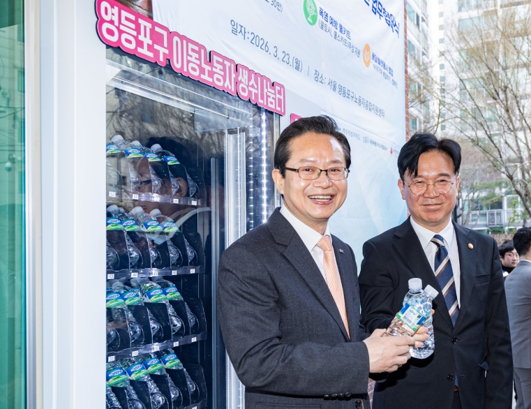 [뉴스노크=김인호 기자] 영등포구는 지난 20일, 김영훈 고용노동부 장관이 당산동에 위치한 ‘이동노동자 쉼터 1호점’을 방문해 현장을 살피고, 관계기관과 함께 이동노동자 온열질환 예방을 위한 생수 나눔 업무협약을 체결했다고 밝혔다.