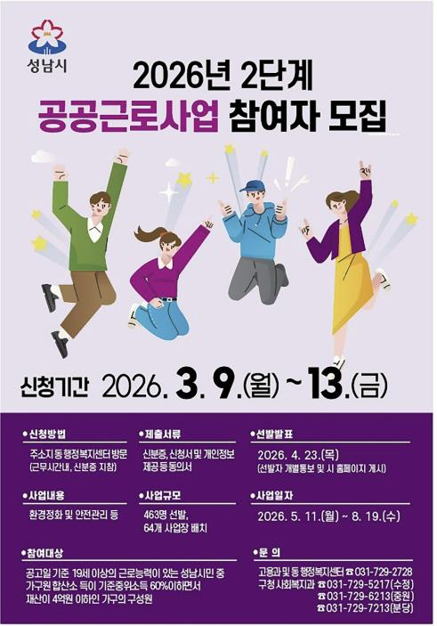 [뉴스노크=김인호 기자] 성남시는 오는 3월 9일부터 13일까지 ‘2026년도 2단계 공공근로사업’ 참여 희망자 463명을 모집한다.