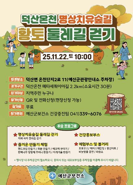 [뉴스노크=김인호 기자] 예산군보건소는 11월 22일 오전 10시 덕산면 명상치유숲길에서 둘레길 걷기 행사를 개최한다고 밝혔다.