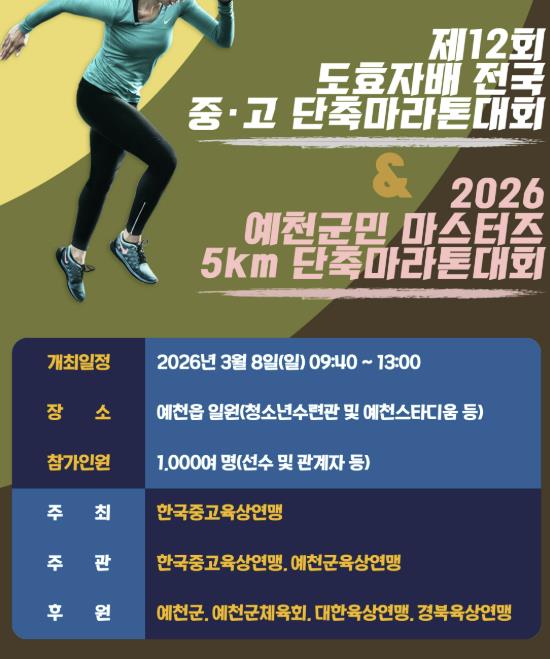 [뉴스노크=김인호 기자] 예천군은 오는 8일 오전 10시부터 예천읍 일원에서 '제12회 예천 도효자배 전국 중·고 단축마라톤대회' 및 '2026 예천군민 마스터즈 단축마라톤대회'를 개최한다고 밝혔다.