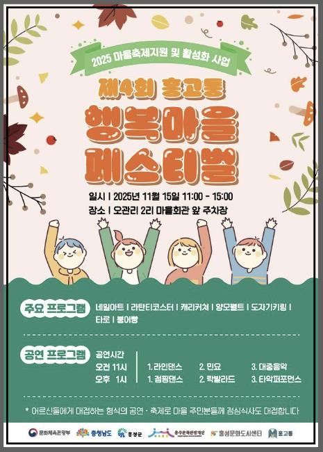 [뉴스노크=김인호 기자] 홍성군은 15일 오관2리 마을회관 주차장 일원(홍성읍 조양로143번길 35-12)에서 ‘제4회 홍고통 행복마을 페스티벌’을 개최한다고 밝혔다.