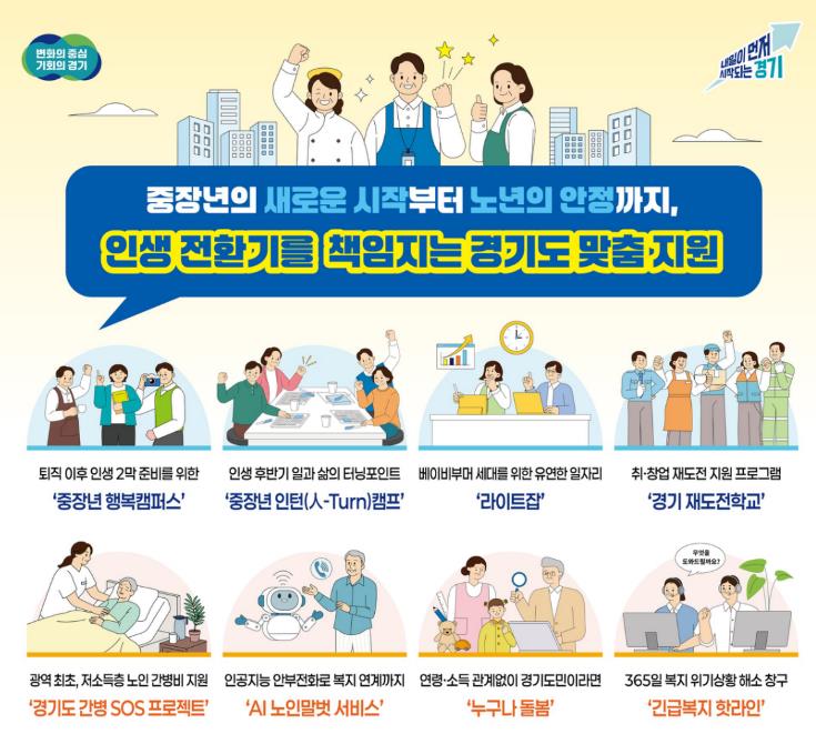 [뉴스노크=김인호 기자] 퇴직 이후의 삶을 어떻게 꾸려야 할지 고민하는 중장년부터, 간병과 돌봄 문제로 어려움을 겪는 어르신과 가족까지. 경기도는 올해도 도민이 인생의 전환기에서 새로운 기회를 얻고 안정적으로 생활할 수 있도록 맞춤형 정책을 계속해 나간다.