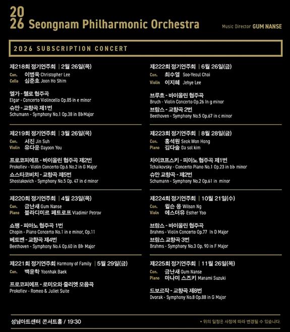 2026년 총 8회 정기공연 라인업을 확정하고, 1월 12일 오후 2시 시즌권을 놀(NOL) 티켓을 통해 오픈한다. 성남시향의 예술총감독 금난새 지휘자를 비롯하여 이병욱, 서진, 백윤학, 최수열, 홍석원, 윌슨 응의 지휘와 첼리스트 심준호, 바이올리니스트 유다윤, 피아니스트 블라디미르 페트로프, 바이올리니스트 이지혜, 피아니스트 김다솔, 바이올리니스트 에스더유, 피아니스트 마나미 스즈키 등의 화려한 협연자를 초청하여 올해 최고의 정기연주회를 마련한다.