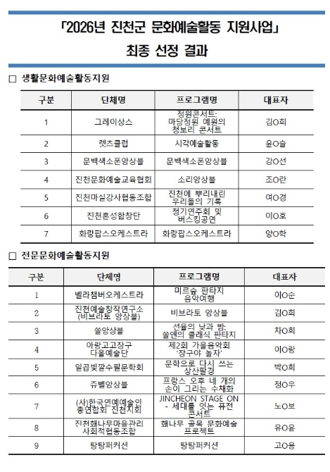이번 사업은 총 5천800만 원 규모로 운영되며, 선정된 단체들은 사업 유형과 규모에 따라 활동비를 지원받아 오는 4월부터 11월까지 진천군 전역에서 공연, 전시, 교육 등 다양한 문화예술 프로그램을 선보일 예정이다.