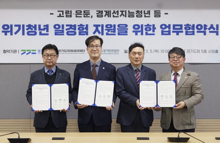 [뉴스노크=김인호 기자] 경기도와 경기도미래세대재단, 한국승강기안전공단 경인지역본부는 5일 경기도청 서희홀에서 ‘위기청년 일경험 지원을 위한 업무협약’을 체결했다.
