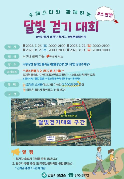 [뉴스노크=김인호 기자] 안동시는 ‘2025 안동 수(水)페스타’ 연계 행사로 진행되는 ‘달빛걷기대회’의 코스를 8월부터 새롭게 변경한다고 밝혔다.