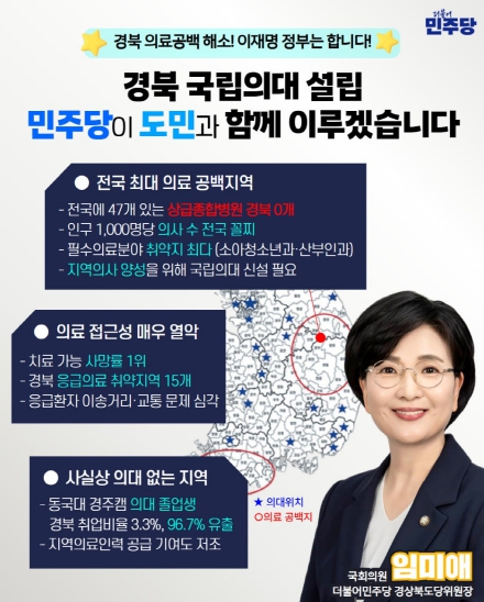 임 의원은 경북 국립의과대학 설립을 위한 웹포스터·카드뉴스·숏폼 영상 등 ‘홍보물 3종 세트’를 제작해 공개했다. 이번 홍보물은 경북의 열악한 의료 지표를 데이터로 시각화하여 전국적인 공감대를 형성하는 데 초점을 맞췄다.