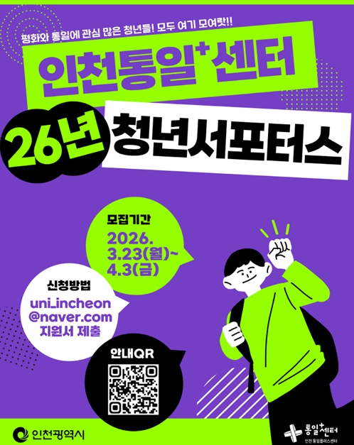 [뉴스노크=김인호 기자] 인천광역시는 청년 주도의 평화·통일 콘텐츠 제작과 확산을 위해 '2026년 인천통일+센터 청년서포터스'를 3월 23일부터 4월 3일까지 모집한다고 밝혔다.
