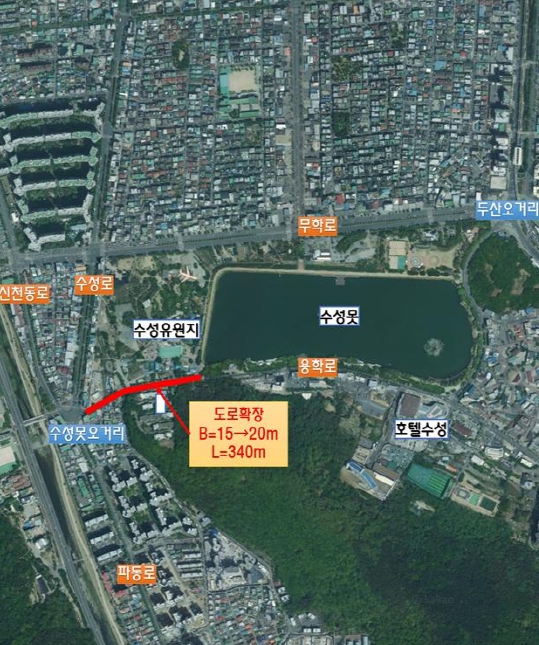 해당 구간은 수성못과 인근 상업시설, 지산·범물지구 등 주요 관광지와 주거지를 연결하는 핵심 접근로임에도 불구하고 도로 폭이 협소해, 평일 출퇴근 시간은 물론 주말에도 잦은 혼잡으로 몸살을 앓던 곳이다.