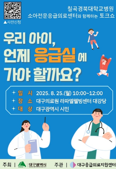 ‘우리 아이, 언제 응급실 가야 할까요?’라는 주제로 진행되는 이번 강연은 칠곡경북대학교병원 소아전문 응급의료센터 최재영 교수가 맡는다.
