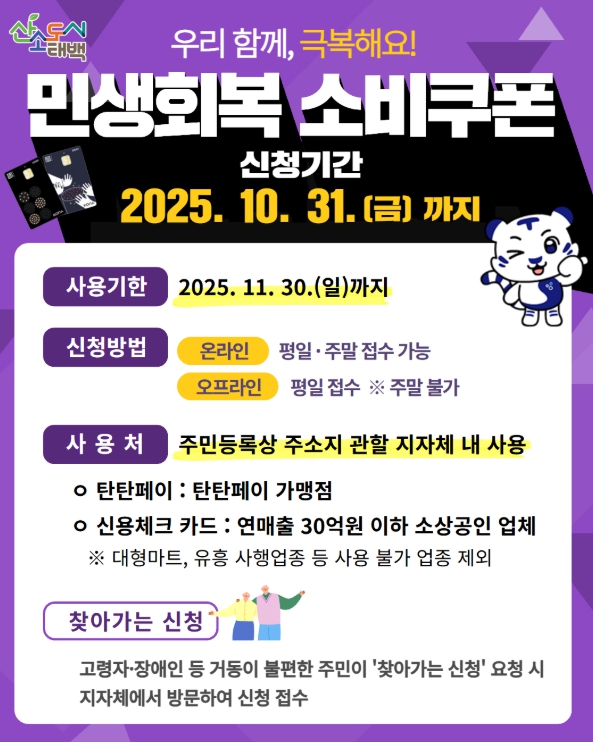 태백시 관계자는 “민생회복 소비쿠폰은 단순한 지원을 넘어 지역 상권을 살리는 마중물 역할을 하고 있다”며 “아직 신청하지 못한 시민은 기한 내 꼭 신청하고, 지급받은 쿠폰은 지역경제 활성화를 위해 기한 내 모두 사용해 주시길 바란다”고 말했다.