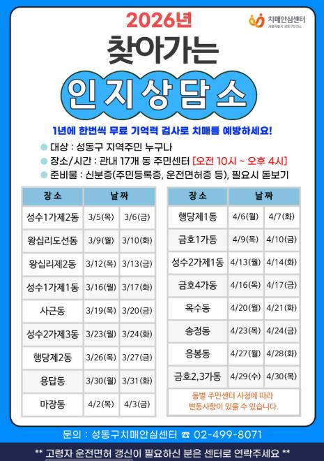 [뉴스노크=김인호 기자] 서울 성동구 치매안심센터는 3월 5일부터 4월 30일까지 17개 동 주민센터를 순회하며 치매 조기 검진을 실시하는 ‘2026 찾아가는 인지상담소’를 운영한다고 밝혔다.