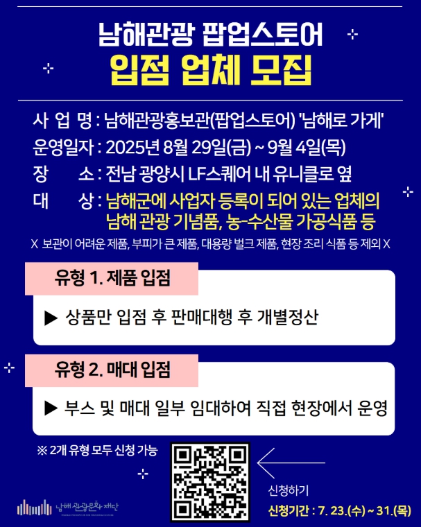 남해관광문화재단 김용태 대표이사는 “이번 홍보관은 단순한 단기 홍보를 넘어, 남해군 관광사업체들의 외부 판로 개척과 브랜드 확장의 시작점이 될 것”이라며, “남해와 가까운 도시에서 소비자와 직접 만나고 싶은 남해 로컬 브랜드의 적극적인 참여를 기대한다”고 밝혔다.