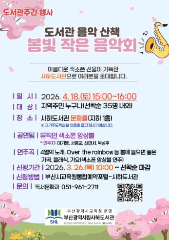 김정남 사하도서관장은 “이번 공연이 아름다운 악기의 선율과 함께 봄을 느낄 수 있는 시간이 되길 바란다”며 “앞으로도 시민들이 함께 즐길 수 있는 다양한 문화 프로그램을 지속적으로 운영하겠다”고 말했다.