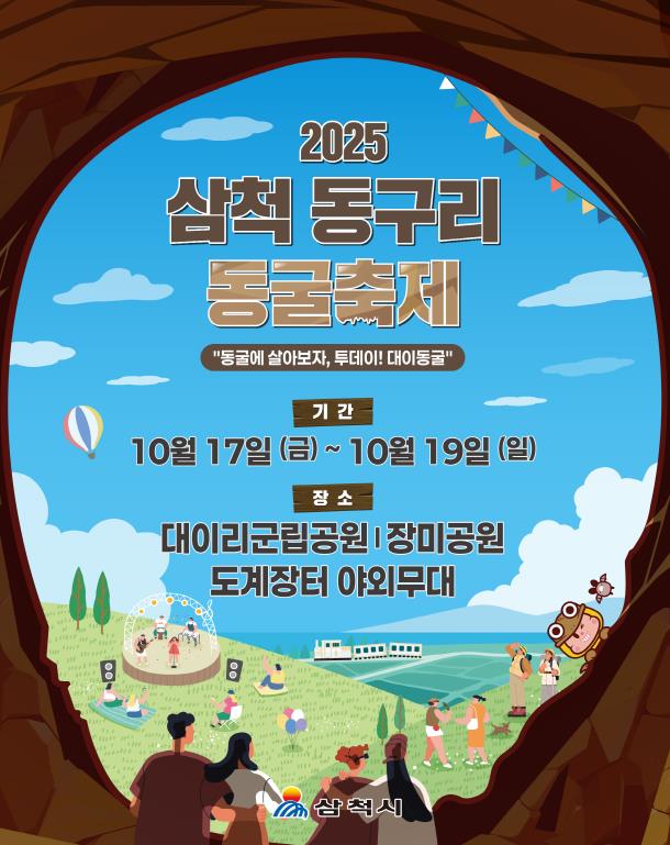 [뉴스노크=김인호 기자] 삼척 동구리 동굴축제가 10월 17~19일 대이리군립공원(대이동굴)·삼척장미공원·도계장터 야외무대에서 동시에 열린다. ‘동굴에 살아보자, 투데이! 대이동굴’을 슬로건으로 한 올해 축제는 가족 공연과 실감형 동굴체험, 도심·생활권 무대를 셔틀망으로 연결하는 분산형 운영으로 하루 동선을 완성했다.