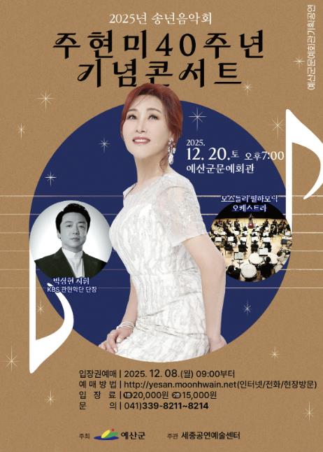[뉴스노크=김인호 기자] 예산군문예회관은 2025년 송년을 맞아 오는 12월 20일 오후 7시 ‘트롯 여제’ 주현미의 데뷔 40주년을 기념하는 콘서트를 개최한다.