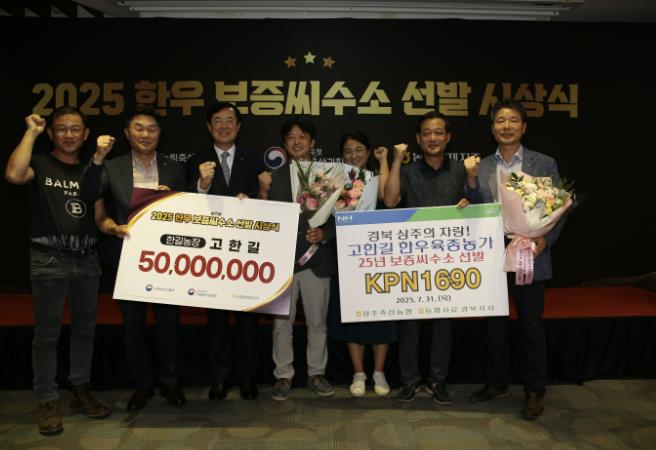 [뉴스노크=김인호 기자] 상주시 한길농장은 7월 31일 농협 안성팜랜드에서 개최된 2025년 한우 보증 씨수소 선발 시상식에서 농촌진흥청 가축개량협의회 유전능력평가 보증씨수소 “KPN 1690”으로 선발됐다.
