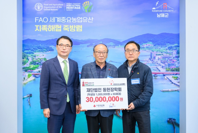 [뉴스노크=김인호 기자] 남해군은 지난 2일 재단법인 동헌장학회(회장 강진용)가 저소득층 학생들을 위한 장학금 3천만원을 기탁했다고 밝혔다.