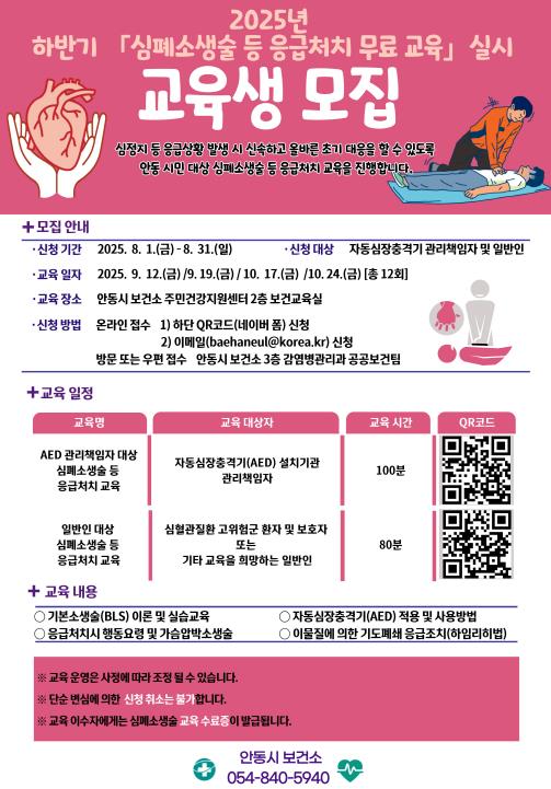 이번 교육은 안동시민, 자동심장충격기(AED) 설치기관의 관리책임자 및 보건소 직원을 대상으로 하며, 안동시 주민건강지원센터 2층 보건교육실에서 진행된다. 교육은 경상북도 위탁기관인 동국대학교 경주병원 심폐소생술 교육센터가 맡아 실습 중심의 전문 교육을 제공할 예정이다.