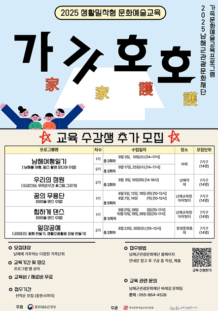 [뉴스노크=김인호 기자] 남해군 관광문화재단은 2025년 생활밀착형 문화예술교육 프로그램 ‘가가호호(家家護護)’의 교육생을 추가 모집한다고 밝혔다.