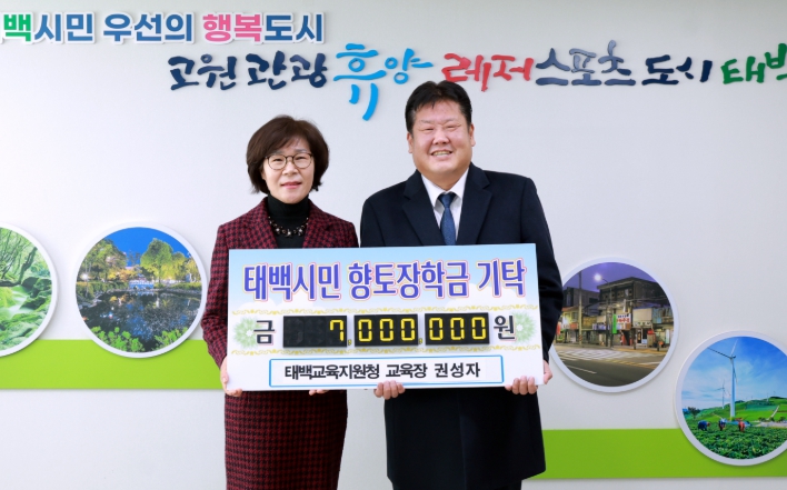 [뉴스노크=김인호 기자] (재)태백시민향토장학회는 강원특별자치도태백교육지원청 권성자 교육장이 오랜 공직생활을 마무리하며 장학금 700만 원을 기탁했다고 밝혔다.