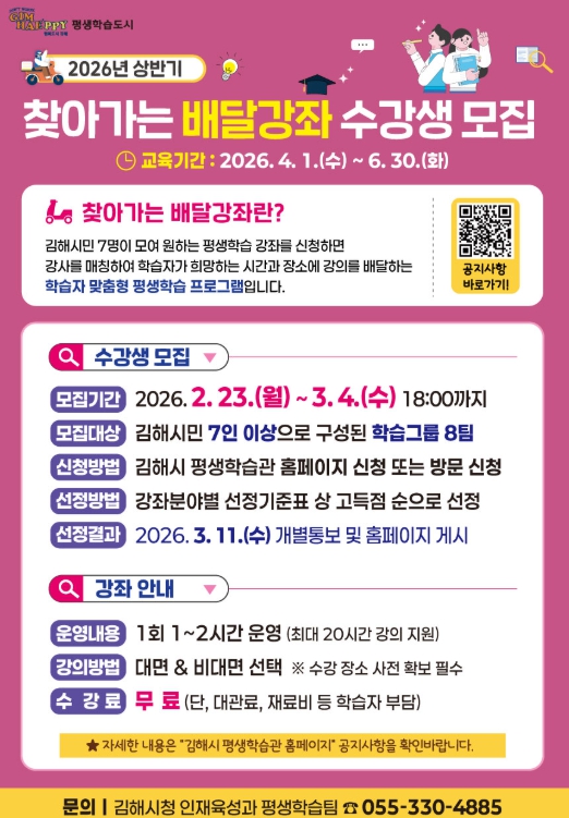 [뉴스노크=김인호 기자] 김해시는 오는 3월 4일까지 상반기 찾아가는 배달강좌 학습자를 모집한다고 23일 밝혔다.