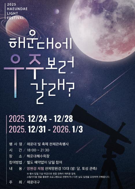 [뉴스노크=김인호 기자] 해운대구가 해운대빛축제 특별 이벤트 ‘우주 보러 갈래’를 12월 24~28일, 12월 31일~1월 3일에 운영한다.
