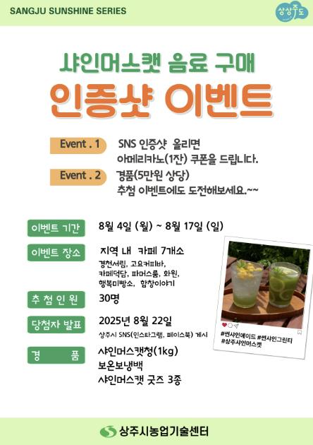 [뉴스노크=김인호 기자] 상주시농업기술센터는 샤인머스캣 시그니처 음료 소비확대 및 지역 농산물 홍보를 위해 8월 4일부터 8월 17일까지 SNS 인증샷 이벤트를 진행한다.